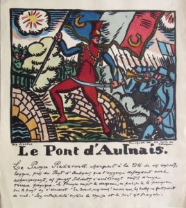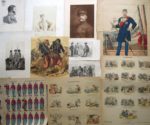 146. [ESTAMPES]. MILITARIA.Diverses estampes, portraits et scènes militaires (26 pièces), dont : • ARNOUX (Guy, 1886-1951). Le Pont d’Aulnais (Radziwill). Bois gravé en couleurs. 35 x 31,5 cm. Bel état. • NAUDIN (Bernard). Soldat en Marche. Tiré à 80 ex. sur Van Gelder dont celui-ci. Papier bruni. Sous verre. • Nouvelle Imagerie d’Épinal. Artillerie Russe / Garibaldini. 2 lithographies en couleurs (Imp. lith. Olivier-Pinot). Bon état. • MORIN (Louis). La Fontaine l’avait bien dit !… Imp. Orsoni. Grande planche (55 x 37 cm env.) en couleurs. Petites déchirures. • LASTEYRIE (Comte de). Marquis de Belot. Lithog. Lasteyrie. Lithographie marquée CLP 1817. 22,5 x 16,5 cm. Qq. rousseurs. • Carnet de la Sabretache. Réunion de 5 illustrations en couleurs. • MANUEL (Henri). Portrait du Général Marie-Eugène Debeney (1864-1943). Tirage albuminé contrecollé sur papier fort, signé Henri Manuel au crayon. 21 x 15 cm. Portrait identifié par B. Malvaux, expert CNES. • MAZIN. Plans, profils et élévation d’un Corps de Cazernes en deux Pavillons propre à loger les troupes du Roy… Juillet 1718. Grand plan, 53 x 70 cm (mouillures et déchirures, qq. restaurations).