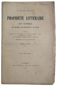 153. BIBLIOGRAPHIE, HISTOIRE du LIVRE, XIXe siècle. Réunion d’ouvrages et plaquettes dont : • BAUDRILLART (Henri). Pertes éprouvées par les Bibliothèques Publiques de Paris pendant le siège par les Prussiens en 1870 et pendant la domination de la Commune révolutionnaire en 1871. 2e édition revue et corrigée. Paris, Techener, 1872. In-8, broché. Couverture imprimée. 32 pp. Non coupé. • CHARPENTIER. De la Prétendue Propriété Littéraire et Artistique. Paris, chez l’Auteur, 1862. In-8, broché. Couverture imprimée. 31 pp. Extrait de la Revue Nationale. • [CRAPELET]. DIBDIN (Thomas Frognall). Lettre Trentième concernant l’Imprimerie et la Librairie de Paris, traduite de l’Anglais, avec des Notes, par G.A. Crapelet. Paris, Crapelet, 1821. Grand in-8, reliure papier gaufré rouge, dos lisse orné, roulette ornée en encadrement sur les plats. Qq. frottements, coins usés. (4)-viii-71 pp. Rousseurs marquées. Ex-libris manuscrit : Leo Larguier 1936. Lettre issue de l’ouvrage Voyage Pittoresque en France et en Allemagne, relatif a la Bibliographie et aux Antiquités par le Rev. Th. Frognall Dibdin, ministre anglican et bibliophile, paru en 3 vol. abondamment illustrés. • DUNOYER (Charles). La Bibliothèque du Roi. S. l. (Paris), s. n. (Imp. Fournier), s. d. (1839). In-8, broché. Sans couverture. 27 pp. Qq. rousseurs. Nommé Administrateur général de la Bibliothèque royale le 22 février 1839, Dunoyer en démissionna le 29 juin suivant. Une notice manuscrite attribuée à l’historien Paul Lacombe indique «Très rare». • GAY (J.). Ce qu’on appelle la Propriété Littéraire est nuisible aux auteurs, aux éditeurs et au public… Paris, l’Auteur, 1862. In-8, broché. Couverture imprimée. 16 pp. • RACINET (Charles). De la Revendication des Livres Estampes et Autographes appartenant à la Bibliothèque Impériale et à la Bibliothèque Sainte-Geneviève. Paris, Bonaventure et Ducessois, Août 1858. In-8, broché. Couverture imprimée. Déchirures au dos. (4)-86 pp. • WELSCHINGER (Henri). La Direction Générale de l’Imprimerie et de la Librairie. Paris, Quantin, 1885. Grand in-8, broché. 22 pp. Petites déchirures restaurées. Extrait du Livre. Envoi de l’auteur à Anatole France en tête de la première page.