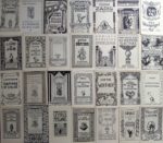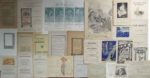 155. ÉDITION, IMPRIMERIE, LIBRAIRIE … Réunion de papiers, spécimens, catalogues… Cachet de la collection Debauve sur la majorité des documents. XXe siècle. • Lot de papiers provenant d’archives du relieur et éditeur Gruel (selon une note de J.-L. Debauve) comportant des défets de Bible enluminée sur parchemin, des encadrements pour une Bible, des prospectus d’éditeur, un dessin original attribué à l’illustrateur Georges Vallée pour la couverture d’un roman intitulé Blanche contre Jaunes de Pierre Maël • Lot de prospectus et catalogues d’éditeurs et de collections dont A l’enseigne du Pot cassé (env. 30 pièces), Rieder (1932), Firmin-Didot (1949), Hachette (1921), éditions de la Roseraie (1927), éditions du Divan (1939)…- • PONTY (Max, 1904-1972). Un Hommage à Max Ponty. (Flammarion, 1991). Jeux d’épreuves (B.A.T.) : Réunion d’un exemplaire d’épreuves (format in-folio, manque 1 f.) pour cet ouvrage d’hommage à Max Ponty auquel ont participé plus de quarante artistes et des épreuves d’essai des illustrations avec corrections pour le tirage (plus de 60 pl. ou cahiers).