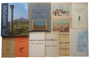 169. [ALGÉRIE]. ARCHÉOLOGIE. Réunion d’ouvrages dont : • COLLECTIF. Arrondissement de Mila. Constantine, Imp. Chapelle, 1960. In-8, broché. (6)-113-(6) pp. et une carte dépliante en couleurs. Photographies et dessins dans le texte. On joint un autre exemplaire en feuillets. On joint un tapuscrit avec corrections de Jean-Louis Debauve (4 ff.) intitulé Par les champs et par les … années du Pays Milevien. • DELESTRE (X.). Hippone. Aix-en-Provence, Edisud, 2005. In-4, reliure éditeur, jaquette illustrée. 256-xxiv pp. Belle iconographie. • MAREC (Erwan). Monuments Chrétiens d’Hippone. Ville épiscopage de Saint Augustin. Paris, Arts et Métiers graphiques, 1958. In-4, broché. Dos insolé. 260 pp. et 3 pl. en couleurs hors texte. Nombreuses photographies et figures dans le texte. Tirage à 350 ex. dont celui-ci, un des 2000 ex. numérotés réservés au Ministère de l’Algérie. • REBOUD (Dr V.) et GOYT (A.). Excursions Archéologiques dans les Environs de Milah et de Constantine (1878-1879). Supplément avec 4 pl. par V. Reboud. Constantine, Ad. Braham, 1881. In-8, broché. 33 pp. et 4 pl. dépliantes. Envoi de l’auteur. • LESCHI (L.). Djemila. Antique Cuicul. Alger, Imp. Officielle, 1950. In-8, broché. 44-(4) pp. et une carte. Nombreuses photographies. • ROZET (Georges). Réunion de deux volumes : Les Ruines Romaines et les Hauts-Plateaux. La Route de Constantine et la Côte Est. Publications du Centenaire de l’Algérie. Paris, Horizons de France. s. d. 2 vol. in-8 oblongs, brochés. Chacun 64 pp. Photographies en sépia.