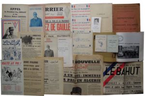 173. [ALGÉRIE]. HISTOIRE. Réunion de plaquettes, tracts, journaux, coupures de presse et divers papiers liés à la Guerre d’Algérie et l’Indépendance, Années 1956-63, dont : Journaux dont Messages d’Algérie (1957, 1958) Algérie Nouvelle (1958) Vérité Liberté - Cahiers d’information sur la Guerre d’Algérie (1960)… La plupart situés à Mila où J.-L Debauve exerçait la fonction de juge de paix. Cachet de la collection Debauve sur plusieurs documents.