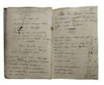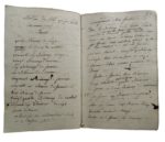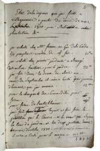 179. ANJOU. Registre de Compte Domestique à Vilguenais (orthographié Villeguenais, Commune de Baugé). 1810-1823. Cahier petit in-8, en partie débroché, couverture recouverte d’un parchemin (manques en pied). Registre de 98 ff. (manque f. 3-4 et 7 à 15, 42 à 45, 87) portant le nom de Simphorien (ou Louis) Gouin, d’une écriture difficile, comportant de nombreux passages rayés. Registre donnant les dépenses pour des matériaux de construction (tuffeau, ardoise, chaux…), des achats pour les plantations d’arbres et des semences (boisseaux de froment, orge, avoine, seigle…), des ventes de bétail, laine, beurre…, des dates de saillie, détaillant les coûts des journées de journalier, charpentier, maçon…
