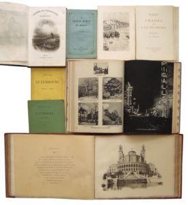 182. [PARIS & Ile-de-France]. Réunion d’ouvrages dont : • DUPIN (Gustave). Les Nymphes du Luxembourg au Sénat. Paris, Dentu, 1866. Plaquette in-8, broché. 11 pp. Envoi de l’auteur à M. Tardif. • FORTOUL (H.). Les Fastes de Versailles depuis son origine jusqu’à nos jours. Paris, Houdaille, 1844. In-8, reliure demi-chagrin vert, dos à 4 nerfs orné. Frontispice, titre gravé, (8)-327-(6) pp. et 22 pl. hors texte. Rousseurs, papier bruni. • FRIÈS (Charles). La Nouvelle Machine de Marly. Paris, Vve Bouchard-Huzard, 1860. Plaquette in-8, broché. 32 pp. Rousseurs. • HENRIOT (Émile). Images de l’Ile-de-France. Pointes sèches de Ch. Samson. Paris, Les heures claires, 1945. In-8, en ff. sous chemise et étui de l’éditeur (dos passé). Illustré de12 pointes sèches. Bon état intérieur. Édition originale. Exemplaire sur B. F. K. de Rives numéroté. • Paris. Monuments. Paris, Héliotypies E. Le Delay, s. d. (vers 1900). In-4 oblong, reliure éditeur demi-cuir rouge façon maroquin. Épidermures, plats très lâches. Recueil de 50 belles vues animées en héliotypie sur B.F.K. sous serpente légendée (quelques-unes froissées).