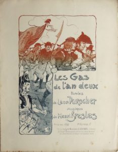 209. [BRETAGNE - MUSIQUE]. Réunion de partitions et divers dont : • BOTREL (Théodore). Berceuse Blanche. Musique de Abel Soreau. Nantes, Landreau, s. d. Partition in-4, couverture illustrée. Etat d’usage. • COMMEQUIERS (de). Le Combat des Trente. Musique de B. de Saint-Pern. Nantes, Sicard, s. d. Partition in-4, Couverture illustrée par F. Donné 1828 (lith. Mellinet). 4 pp. • DUROCHER (Léon). Les Gas de l’An Deux. Musique de Henri Bresles. Paris, Coutarel, s. d. (1903). Partition in-4, couverture illustrée. Qq. rousseurs. • DUROCHER (Léon). Départ des Goélettes. Musique de Henri Bresles. Chantée par Jane Dyt. Paris, Coutarel, s. d. (1903). Partition in-4, couverture illustrée. Qq. rousseurs. • [Film]. Chanson d’Ar-Mor. Réalisation de Jean Epstein d’après l’œuvre de Jean des Cognets. Musique de Jacques Larmanjat dirigée par Roger Désormières. Rennes, L’Ouest-Eclair, 1934. Programme (4 pp., état d’usage) et plaquette de présentation (20 pp.) du film le 23 nov. 1934 au Cinéma Le Royal à Rennes.