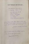 213. BRIANT (Théophile). Réunion de trois ouvrages : • Les Pierres m’ont dit. Burins de Bordeaux-Le Pecq. Paris, Nouvelle Librairie Celtique, 1955. In-4, en ff. sous chemise et étui (un peu défraîchi) de l’éditeur. 221 pp. Illustrations dans letexte et à pleine page. Ouvrage tiré à 10 ex. de collaborateurs et 247 ex. numérotés sur vélin pur fil Johannot dont celui-ci (n° 166), avec 24 gravures, enrichi d’un bel envoi sur le faux-titre au professeur Daniel Ferey. • Vingt-Cinq Poèmes de la Tour du Vent. Lithographies de Louis Roger. Les Exemplaires, 1955. In-4, en ff. Couverture rempliée (dos légèrement insolé). Non paginé. Illustré de 6 lithographies à pleine page par Louis Roger (1928-2018). Edition originale tirée à 99 ex. hors commerce numérotés et nominatifs sur velin du Marais. Celui-ci, sans colophon (manquant ?), porte le n° I en chiffre romain. • Sabatrion. Paramé, éditions du Goéland, 1938. In-12, agrafé. 31-(1) pp. Bel envoi de Th. Briant à mon amie Reine Gianoli ce démon crépusculaire qui n’est pas pour elle bien affectueusement. La Tour du Vent. 19 juin 1938. • Collectif. Th. Briant. Les amis de la Tour du Vent, 1996. Envois.