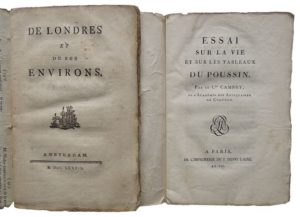 215. [CAMBRY (Jacques)]. Réunion de deux ouvrages : • Essai sur la Vie et sur les Tableaux du Poussin. Paris, Didot l’Ainé, An VII. In-8, broché. Couverture d’attente. 62 pp. Non coupé. Édition originale. • De Londres et de ses Environs. Amsterdam, s. d., 1789. In-8, broché. Couverture d’attente muette. 121 pp. L’édition originale est parue l’année précédente. Jacques Cambry (Lorient, 1749-1807), fondateur de l’Académie celtique, est également l’auteur d’un Voyage dans le Finistère. Barbier II, 1341.