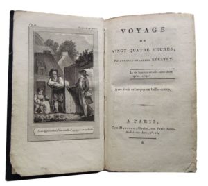 218. KÉRATRY (Auguste-Hilarion). Réunion d’ouvrages : • Voyage de Vingt-quatre Heures. La vie humaine est-elle autre chose qu’un voyage ? Avec trois estampes en taille-douce. Paris, Maradan, [An] 8. In-12, reliure à la bradel papier bleu nuit. Plats frottés, coins et coiffes usés. (6)-245-(1) pp. Qq. rousseurs. Édition originale. Complet de ses 3 planches dont le frontispice. • Les Derniers des Beaumanoir, ou La Tour d’Helvin. Paris, Bossange, Gosselin, Lecointe et Durey…, 1825. 4 volumes in-12, brochés. T. 1 : (4)-iv-240 pp. T. 2 : (4)-230 pp. Petite déchirure en tête de la page de titre. T. 3 : (4)-237 pp. Coins supérieurs manquants sur 2 ff. T. 4 : (4)-275 pp. Rares rousseurs sur l’ensemble des volumes. Bon état général. • Lusus et Cydippe, ou Les Voisins dans l’Arcadie. Poème traduit du Grec. Paris, Maradan, An IX. Deux tomes en un volume in-12, reliure demi-maroquin caramel à grains longs, dos lisse orné. Coiffes et coins légèrement frottés. (2)-frontispice-(2)-xviij-162; (2)-frontispice-(2)-168 pp. Rares rousseurs. Bon état.