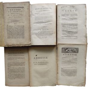 220. LEQUINIO (Joseph Marie). Réunion d’un ouvrage et de plaquettes : • Les Préjugés Détruits. Seconde Édition, revue et corrigée par l’auteur. Ce 1er janvier, l’an II de la République. Paris, Derenne, Debray, 1793. In-16, reliure de l’époque cartonnage papier brun, titre à l’encre sur une étiquette au dos. Qq. frottements, coins émoussés. (8)-367 pp. Qq. rousseurs. Seconde édition (l’originale est parue l’année précédente) signée par l’auteur : Lequinio, Citoyen du Globe. Important ouvrage de Lequinio (1755-1814) dans lequel il aborde divers sujets, traitant tour à tour de la religion : La nécessité d’abandonner désormais toutes nos idées religieuses est assez prouvée par la seule variété innombrable des religions et par les absurdités plus ou moins choquantes dont elles regorgent toutes…; des rois : Mettez sur le trône un sage descendu des cieux exprès, et bientôt il sera despote et tyran, et presque malgré lui…; des laboureurs : cette classe malheureuse à qui la société doit tout, et que la société toute entière a, chez toutes les nations, abandonnée dans les déserts où sans cesse elle sillonne au profit des villes…; des femmes qu’il encourage à s’instruire et à renoncer aux frivolités pour devenir les égales des hommes; des esclaves : Par quelle fatalité se fait-il qu’un individu devienne la propriété d’un autre individu?… L’homme esclave est toujours mon frère… l’esclavage est enfant de la barbarie fille de l’ignorance; de la peine de mort : … une Nation n’a pas le droit de ravir l’existence à un individu quel qu’il soit; que c’est commettre une barbarie au nom de la loi et rien de plus… Des prises de position qui seront en partie démenties par ses actes lorsqu’il votera la mort du roi, tuera un détenu, sera dénoncé par la commune de Rochefort « pour ses orgies, pour l’établissement du tribunal révolutionnaire et de la guillotine en permanence, pour l’admission fréquente du bourreau à sa table, etc. »… • Elixir du Régime Féodal, autrement dit Domaine congéable en Bretagne. Paris, Pain, 1790. In-8, broché. Sans couverture. 124 pp. Non coupé. • Lettre à M. Bertrand, Ministre de la Marine. Imp. de Fiévée, s. d. (1791). In-8, broché. [16] pp. Extrait du N° 43 du Journal des Laboureurs. (Journal édité par Lequinio de mai 1791 à février 1792). • Adresse Populaire aux Habitants des Campagnes. Ce 1er janvier, l’an II de la République. Nismes, C. Belles, 1791. In-8, non broché. 16 pp. Texte dans lequel il prône la tolérance politique et religieuse, l’obéissance aux lois, réfute toute violence… • Sur les Troubles Religieux. Imp. Nationale, s. d. (4 pp.).