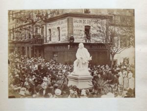 229. [MORBIHAN]. MASSÉ (Victor). Album de famille relatif à l’inauguration de la statue du compositeur lorientais Victor Massé (1822-1884) érigée le 4 septembre 1887 à Lorient. In-4, reliure demi-chagrin brun, dos à 5 nerfs (tome chiffré 1). Qq. frottements. Bel album constitué par ses descendants, comportant une lettre autographe de Jules Massenet, une photographie du projet de la statue et 3 photographies (tirages d’époque) de l’inauguration de la statue, des imprimés du Comité Victor Massé et de la municipalité, le menu du banquet, des télégrammes de la famille et d’amis, de nombreuses coupures de presse, le journal L’Avenir de Lorient du 7 sept. 1887, etc. Provenance (note de J.-L. Debauve) : succession Victor Gille, fils de Philippse Gille (librettiste et écrivain, gendre de Victor Massé). • On joint : Victor Massé par A. Schalck de la Faverie, Sauvaitre, 1887 (plaquette in-8, brochée. Couverture défraîchie). • Discours prononcé à l’inauguration de la statue… par Léo Delibes et Jules Simon. Firmin-Didot, 1887 (in-4, broché 12 pp.).