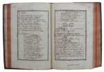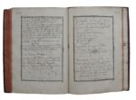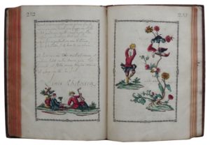 239. PERRET (Rodolphe). Manuscrit. Rhetorica a Reverendo Patre L. de Villeneuve data, et a me scripta Rodolpho Perret; Ploermelo. In Collegio Ventensi (Vannes), Societatis Jesu, 1757. Petit in-4, reliure de l’époque basane brune, dos 5 nerfs, pièce de titre veau fauve. Titre imprimé et 332 pp. manuscrites (et 8 pp. vierges) encadrées d’une frise sur bois gravée. Le Cours de Rhétorique (jusqu’à la page 272) est suivi de plusieurs courts textes, poèmes, odes, épigrammes, contes, énigmes… parmi lesquels Ode sur la prise de Namur (Boileau), Sur l’aveuglement des hommes du siècle (J. -B. Rousseau), Epigramme sur un huissier (J. -B. Rousseau), etc. Quelques images découpées de gravures anciennes et coloriées ont été collées sur les pages de garde et entre les deux parties du manuscrit. Manuscrit attribué à Rodolphe Claude Perret de Trégadoret (1741-1798), maire de Ploërmel de 1776 à 1779, député de cette ville à l’Assemblée Nationale et à la Convention de 1789 à 1794.