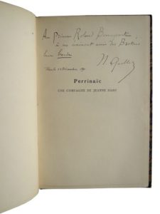 241. QUELLIEN (Narcisse). Perrinaïc. Une Compagne de Jeanne d’Arc. Paris, Fischbacher, 1891. In-8, reliure à la Bradel percaline verte, pièce de titre en long au dos. Couverture conservées (rousseurs). (4)-43-(2) pp. Ex-libris gravé : Prince Roland Bonparte. Édition originale avec un envoi de l’auteur sur le faux-titre : Au Prince Roland Bonaparte, à un éminent ami des Bretons, leur barde N. Quellien suivi d’une note manuscrite : Reçu le 28 décembre 1891. Vicaire VI, 875.