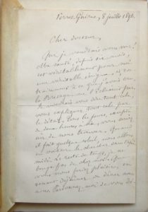 243. RENAN (Ernest). Ma Sœur Henriette. Avec illustrations d’après Henri Scheffer et Ary Renan reproduites par l’héliogravure. Paris, Calmann Lévy, 1895. In-8, reliure de l’époque signée Paul Vié, plats recouverts d’un tissu à motif floral (usures sur les coupes et coins), pièce de titre au dos, chiffre JB estampé sur le plat. (4)-iii-96-(1) et 6 planches hors texte sous serpente légendée dont deux portraits. Ex-libris : Jules Bosnier. Cette édition tirée à 125 exemplaires numérotés sur Japon est une réimpression du rare opuscule publié en 1862, tiré à 100 exemplaires sous le titre Henriette Renan ; Souvenir pour ceux qui l’ont connue. Notre exemplaire, non justifié, est accompagné de trois lettres autographes adressées de Rosmapamon en 1892 : 1 l. a. s. d’Ernest Renan (8 juillet) à son médecin, le Dr Le Dantec à Lannion, dans laquelle il évoque ses problèmes de santé et loue ses compétences ; 1 lettre (13 sept.) dictée à son épouse, invitant son médecin à passer le voir ; et une lettre signée de Cornélie Renan (17 sept.) au même médecin, lui annonçant leur départ pour Paris et le remerciant pour les soins excellents prodigués à son mari. Ernest Renan (1823-1892) est décédé le 2 octobre, quelques jours après son retour dans la capitale.