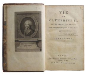 259. [CASTÉRA (Jean-Henri)]. Vie de Catherine II, Impératrice de Russie. Avec six Portraits gravés en taille-douce. Paris, Buisson, An V (1797). 2 volumes in-8, reliure de l’époque veau marbré, dos lisse orné, roulette ornée en encadrement sur les plats. Qq. épidermures et trous de vers, coiffes et coins usés. T. 1 : Frontispice, (4)-iv-427 pp. et 2 pl. hors texte. T. 2 : Frontispice, (4)-467 pp. et 2 pl. hors texte. Rousseurs. Ouvrage complet des 6 portraits (Catherine II, Pierre III, Grégoire Orloff, Poniatowsky, Paul Ier, Prince Potemkine) gravés par Tardieu. Édition originale.