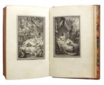 Édition dite des Fermiers Généraux 266. LA FONTAINE (Jean de). Contes et Nouvelles en Vers. Amsterdam (Paris), s. n., 1762. 2 volumes in-8, reliure maroquin rouge, dos à 5 nerfs orné (fers à l’urne), pièces de titre et de tomaison maroquin brun, roulette ornée en encadrement sur les plats, roulette sur les coupes et roulette intérieure, tranche dorées. Hormis un tout petit trou sur le second plat du tome 1, reliure en bel état sans restauration. Chemises de maroquin rouge à recouvrements simulant un dos de reliure à 5 nerfs avec date en pied et intérieur doublé de peau de chamois, étui bordé (attribuées à Lortic selon une fiche de vente jointe). T. 1 : Frontispice (portrait de La Fontaine gravé par Ficquet d’après Hyacinthe Rigaud orthographié Rigault), xiv-(2)-268-(2) pp. et 48 figures hors texte. T. 2 : Frontispice (portrait de Charles Eisen gravé par Ficquet d’après Vispré), (2)-viii-(2)-306-(3)-2 bl.-16 pp. et 48 figures hors texte. En fin de volume a été placé l’Avis au relieur pour placer les estampes des Contes de M. de La Fontaine (16 pp.). Petite trace de mouillure dans la marge supérieure d’une quinzaine de feuillets sur le tome 1 et en tête de la page de titre du t. 2, qq. rousseurs sur les deux volumes, le plus souvent situées au verso des figures. Édition éditée à Paris par Barbou aux frais des Fermiers Généraux, illustrée de deux portraits gravés par Ficquet et de 80 figures d’Eisen, 4 vignettes dont deux hors texte, fleurons et 53 culs-de-lampe par Choffard dont le dernier contient son portrait. À cet exemplaire ont été ajoutées 15 figures dont 14 refusées. Au t. 1 : Le Cocu batu et content, Le Savetier, La Servante justifiée, Le Calendrier des vieillards, A femme avare galant escroc, On ne s’avise jamais de tout, La Clochette, Sœur Jeanne. Au t. 2 : Les Oies de frère Philippe, Richard Minutolo, Les Rémois, Le Tableau, Le Contrat, Le Rossignol. Le Cas de Conscience est en deux états, couverte (semble-t-il plus rare) et découverte, Le Diable de Papefiguière et Les Lunettes sont découvertes. Parmi les variantes des figures, on note celle d’Alix Malade non terminée, Le Faucon avant le bracelet, Féronde avant le bonnet ; Le Remède avec ornements sur les rideaux ; Le Tableau avec ornement sur le mur ; le portrait de Choffard avant les tailles. L’édition renferme 64 contes, la dissertation sur la Joconde et cinq contes placés en fin du tome 2. Précédemment attribués à La Fontaine, l’éditeur « n’a pas osé les rejetter (sic) » parce qu’ils étaient présents dans les éditions précédentes mais les noms de leurs auteurs ont été rétablis. Précieux exemplaire de ce « chef-d’œuvre d’Eisen » (1700-1778) composé par un amateur de l’époque d’un beau choix d’épreuves avec les pièces supplémentaires dont il disposait au moment de l’exécution de la reliure, soit en tout 2 portraits et 95 figures. Provenance : De la Bibliothèque H. de Vrainville, n° 152 de sa vente in Livres rares et précieux, gravures, dessins composant la bibliothèque de feu M. H. de V[rainville]. 22-23 avril 1926. Cat. rédigé par Jules Meynial. Brunet III, 759 ; Cohen p. 558-569 ; Rochambeau 79.
