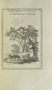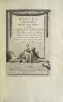267. LA FONTAINE (Jean de). Fables Choisies, mises en vers par J. de La Fontaine. Nouvelle Edition gravée en taille-douce. Les Figures par le Sr Fessard. Le Texte par le Sr Montulay. Dediées aux Enfans de France. Paris, chez l’auteur [Fessard], 1765-1775. 6 volumes in-8, reliure veau marbré, dos lisse orné, triple filet doré avec fleurons d’angle en encadrement sur les plats, pièces de titre maroquin rouge et de tomaison maroquin vert, tranches marbrées. Qq. épidermures ou griffures sur les plats, dos craquelés, mors et coupes frottés. T. 1 : (2)-frontispice-lxxi-100 pp. et 44 pl. ; T. 2 : vi-102 pp. et 40 pl. ; T. 3 : (4)-95 pp. et 43 pl. ; T. 4 : (6)-134 pp. et 45 pl. ; T. 5 : (4)-103 pp. et 35 pl. ; T. 6 : (6)-115 pp. et 36 pl. Légers ressauts de cahiers aux tomes 1, 4 et 6, papier de qualité sans rousseurs. Exemplaire à grandes marges (20,1 x 12,5 cm). Ex-libris : Daniel Guestier Bordeaux. Édition entièrement gravée illustrée de 6 titres (titre du t. 1 gravé recto-verso), un frontispice (au t. 1), 243 figures hors texte, 243 vignettes en-tête des fables et 226 culs-de-lampe gravés par Fessard d’après Bardin, Bidault, Caresme, Desrais, Houël, Kobell, Leclère, Leprince, Loutherbourg, Meyer et Monnet. Le texte est entièrement gravé par Montulay et Drouët. Étienne Fessard (1714-1774) qui avait participé à la gravure de l’édition d’Oudry, souhaitait donner un pendant à l’édition des Contes illustrée par Eisen, en publiant les Fables. Il prit à son service une pléiade de jeunes peintres et grava lui-même leurs dessins. Bien que l’édition ait été critiquée de son temps, elle n’en reste pas moins luxueuse et bien imprimée. Cf. Jean de La Fontaine, sous la direction de Claire Lesage. BNF / Seuil, 1995, p. 156, 165. Brunet III, 753 ; Cohen, 551 ; Rochambeau 101.
