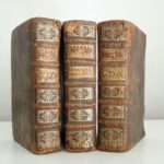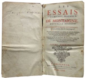 272. MONTAIGNE (Michel de). Les Essais. Nouvelle Edition exactement purgée des defauts des precedentes, selon le vray original. Et enrichie & augmentée aux marges du nom des Autheurs qui y sont citez, & de la Version de leurs Passages … Ensemble la Vie de l’Autheur, & deux Tables, l’une des Chapitres, & l’autre des principales Matieres, de beaucoup plus ample & plus utile que celles des dernieres Editions. Amsterdam, Anthoine Michiels, 1659. 3 volumes in-12, (haut. 14,5 cm), reliure de l’époque veau brun, dos à 5 nerfs orné. Reliures usagées, un peu déboîtées, épidermures et trous ou petites galeries de vers, coins très usés. T. 1 : (50)-468 pp. T. 2 : (4)-708 pp. T. 3 : (4)-510-(76) pp. Manque dernier f. de table. Trou puis petite galerie de ver touchant les gloses en marge d’une centaine de ff. et4 ff. brûlés dans l’angle supérieur au t. 2. Ex-libris manuscrit : Tanqueres Desplanches. Edition recherchée selon les bibliographes. Brunet III, 1837 précise : Cette édition assez bien imprimée est une copie peu correcte de celle de Paris, Journel, en 3 vol. in-12, sous la même date. La seule amélioration qu’on y remarque, c’est une table analytique générale des matières, placée à la fin du 3e volume, et avantageusement substituée aux trois tables particulières de l’édition de Paris.