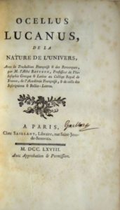 276. OCELLUS LUCANUS. De la Nature de l’Univers. Avec la Traduction Françoise & des Remarques …