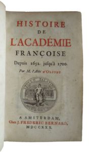 277. OLIVET (Abbé d’). Histoire de l’Académie Françoise depuis 1652 jusqu’à 1700. Amsterdam, Frédéric Bernard, 1730. In-12, reliure de l’époque vélin, titre à l’encre au dos. (6)-406-(14) pp. Rares rousseurs. Vignette gravée sur le titre. Ex-libris gravé par Polak : Aerssen van Sommelsdyck. Ce volume par l’Abbé d’Olivet (1682-1768), grammairien et traducteur, élu membre de l’Académie française en 1723, est la continuation de l’ouvrage de Paul Pellisson sur l’Histoire de l’Académie depuis son établissement jusqu’à 1652. Bon exemplaire.