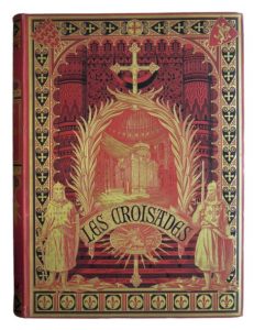 298. [DORÉ]. MICHAUD (Joseph). Histoire des Croisades. Illustrée de 100 grandes compositions par Gustave Doré gravées par Bellenger, Doms, Gusman, Jonnard, Pannemaker, Pisan, Quesnel. Paris, Furne, Jouvet et Cie, 1877. 2 volumes in-folio, cartonnage souple de l’éditeur percaline rouge richement orné d’un décor or et noir. Minime accroc au départ d’un mors. T. 1 : (4)-424 pp. et 50 planches hors texte. T. 2 : (4)-376 pp. et 50 planches hors texte. Intérieur très propre, sans rousseurs. Bel exemplaire dans son cartonnage éditeur de cette première édition remarquablement illustrée par Gustave Doré de L’Histoire des Croisades. Le texte avait été publié pour la première fois de 1813 à 1822. Carteret III, 405 ; Vicaire V, 806.