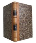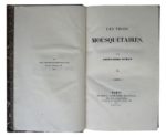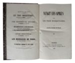 299. DUMAS (Alexandre). Très rare réunion d’éditions originales : 22 volumes in-8, reliure homogène pour l’ensemble signée en pied Lebrun (sauf sur les tomes 7 à 10 de Vingt ans après) demi-veau fauve, dos à 4 nerfs orné de filets noircis (quelques-uns estompés), titre doré sur fond noir (habilement reteinté, d’autres estompés) et filets et frises dorées, tranches jaspé bleu. Qq. traces sur les dos et légers frottements sur les mors, trois petits trous de vers sur le mors du t. 3, deux griffures au dos du t. 5, mors fendillés sur 1,5 cm en pied du t. 6. • Les Trois Mousquetaires. Tomes 1 à 8. Paris, Baudry, 1844. T. 1 : (4)-349 [chiffrée 449]-(1 bl.)-(1) pp.; T. 2 : (4)-329-(1 bl.)-(1) pp.; T. 3 : (4)-386-(1) pp.; T. 4 : (4)-363-(1) pp.; T. 5 : (4)-310-(1); T. 6 : (4)-287-(1); T. 7 : (4)-297-(1 bl.)-(1); T. 8 : (4)-329-(1 bl.)-(1). Complet des faux-titre et titre et du feuillet de table en fin de chaque tome. Qq. rares petites taches dans le papier mais pas ou très peu de rousseurs pâles, manque l’angle inférieur d’un feuillet loin du texte au tome 2. • Vingt Ans Après. Suite des Trois mousquetaires. Tomes 1 à 10. Paris, Baudry, 1845. T. 1 : (4)-332-(1) pp.;T. 2 : (4)-334-(1) pp.; T. 3 : (4)-334-(1) pp.; T. 4 : (4)-319-(1) pp.; T. 5 : (4)-324-(1) pp.; T. 6 : (4)-315-(1 bl.)-(1) pp.; T. 7 : (4)-312-(1) pp.; T. 8 : (4)-312-(1) pp.; T. 9 : (4)-296-(1) pp.; T. 10 : (4)-302-(1) pp. Petite tache brune dans l’angle supérieur de 5 ff., très petit manque de papier dans l’angle de 2 ff. du t. 7; Petite tache brune dans l’angle supérieur de 6 ff. du t. 8; Rousseurs un peu plus présentes sur les tomes 1 à 4, beaucoup plus rares voire inexistantes sur les volumes suivants. Très bel ensemble, complet en 18 volumes, pour ces deux éditions originales des grands romans de cape et d’épée d’Alexandre Dumas, ainsi présentées par Clouzot (Guide du Bibliophile, p. 98-99) qui insiste sur leur rareté : Les Trois Mousquetaires : Rare et très recherché. Rarissime en belle condition d’époque. Vingt ans après : Aussi difficile à rencontrer en belle condition que Les Trois mousquetaires auquel il fait suite. Les Trois Mousquetaires parurent en feuilleton dans Le Siècle entre le 14 mars et le 14 juillet 1844 avant d’être publiés par Baudry peu de temps après. De même, Vingt ans après fut donné en feuilleton entre le 21 janvier et le 2 août 1845 et publié la même année. Carteret I, 235; Vicaire II, 359 et 369. On joint : Le Comte de Monte-Christo. Tomes 1 à 4. Paris, Pétion, 1845. Même reliure que précédemment, signée Lebrun en pied. Petites nuances de teinte sur les dos, qq. usures sur les filets dorés, pièces de titre parfois estompées, un coin cassé en tête du second plat du t. 1. T. 1 : (4)-321-(1 bl.)-(1) pp.; T. 2 : (4)-334-(1) pp.; T. 3 : (4)-311-(1) pp.; T. 4 : (4)-325-(1 bl.)-(1) pp. Beaux exemplaires à grandes marges (21 cm), papier blanc, pratiquement sans rousseurs. Édition originale pour ces 4 (sur 12) premiers volumes. Le Comte de Monte-Cristo, fut publié avec des interruptions dans Le Journal de Débats entre le 28 août 1844 et le 15 janvier 1846, et sa parution en volume commença dès 1845. Vicaire II, 366. Lebrun s’établit à Paris vers 1830 où il exerça jusqu’en 1857 après avoir longtemps travaillé auprès de René Simier dont il fut l’élève. Il obtint une médaille de bronze à l’Exposition nationale de 1844. Fléty p. 107 ; Devauchelle, La reliure, p. 189.
