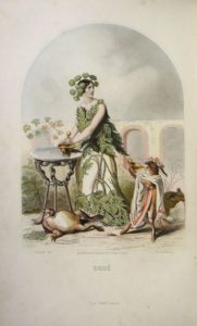 304. GRANDVILLE (J.-J.). DELORD (Taxile, texte). Les Fleurs Animées. Introductions par Alphonse Karr. Nouvelle édition avec planches très soigneusement retouchées … par M. Maubert. Paris, Gabriel de Gonet, s. d. (sur le T. 1), 1867 (sur le T. 2). 2 volumes grand in-8, reliure demi-maroquin brun, dos à 5 nerfs soulignés de filets dorés, initiales L. A. en lettres dorées sur les plats supérieurs. Qq. frottements sur les coiffes et coupes. T. 1 : 262-(1) pp. (manque le frontispice) et 28 pl. en couleurs. T. 2 : Frontispice, (4)-324-(1) pp. et 2 planches en noir et 22 pl. en couleurs. Rousseurs et qq. traces de doigt. Ex-dono sur le faux-titre. Complet des planches hors texte. La première édition est parue en 1847. Carteret III, 286; Vicaire III, 133.