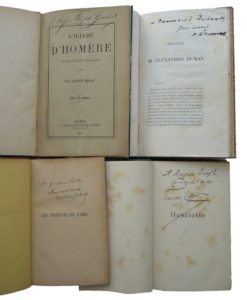 309. LITTÉRATURE XIXe s. Réunion d’ouvrages avec envoi : • COPPÉE (François). Henriette. Paris, Lemerre, 1889. In-8, reliure à la Bradel (signée Féchoz) bleu canard, fleuron doré au dos. Couvertures conservées. (6)-193-(2) pp. Rousseurs. Édition originale. Envoi de François Coppée sur le faux-titre à Monsieur Gung’l. Vicaire II, 986. • DUMAS fils. Discours de Réception de M. Leconte de Lisle. Réponse de M. Alexandre Dumas Fils. Paris, Perrin, 1887. In-8, fine reliure à la Bradel percaline bleue. (4)-72 pp. Édition originale. Envoi d’Alexandre Dumas en tête de son texte : à Raimond Deslandes son ami A Dumas. • MÉNAR (Auguste). L’Iliade d’Homère. Traduction littérale en vers. Paris, Durand et Pedone-Lauriel, 1867. In-8, fine reliure à la Bradel percaline vert sapin à coins. Couvertures conservées. 28 pp. Édition originale. Envoi d’Auguste Ménar à Théophile Gautier en page de garde et ex-dono au même en tête de la couverture. • SCHOLL (Aurélien). Les Ingénues de Paris. Paris, Charpentier et Fasquelle, s. d. (1893). In-8, reliure (signée J. Canape) maroquin orange, dos à 5 nerfs, date en pied, tête dorée. Couvertures conservées. (4)-356 pp. Papier jauni, qq. rousseurs. Édition originale sur papier d’édition (il y a eu 10 Hollande) avec un envoi signé de l’auteur : A gustave Cohen Bien amicalement.