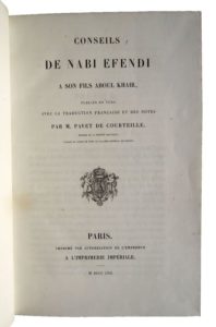 313. NABI (Yusuf). Conseils de Nabi Efendi à son Fils Aboul Khair, publiés en turc avec la traduction française et des notes par M. Pavet de Courteille. Paris, Imprimerie Impériale, 1857. In-8, reliure demi-chagrin vert, dos à 4 nerfs orné. Frottements sur les plats. (4)-iv-100-(68) pp. Qq. rares rousseurs. Bon exemplaire sur papier vergé filigrané K Frères. Poète renommé né à Urfa, Nabi Efendi (1642-1712) se rendit à Constantinople du temps de Mehmed IV où il devint le secrétaire de Mustafa Pacha qu’il accompagna en pèlerinage à La Mecque. Il s’établit à Alep où il composa vers 1694 deux poèmes à l’intention de son fils : le Khair-abd et le Khairiyè, texte ici traduit, qui outre les conseils d’ordre spirituel adressés à son fils peint une satire de son époque, de la Cour et des religieux, derviches et prétendus dévôts. Nabi Efendi sera rappelé quelques années plus tard à Constantinople par Baltadji Mehmed Pacha qui le nomma président de la Chambre des comptes d’Anatolie puis contrôleur de la cavalerie. Professeur au Collège de France, Abel Pavet de Courteille (1821-1889) est l’auteur de nombreuses traductions et d’un dictionnaire turc oriental. Brunet IV, 1.