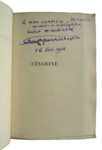 316. RICHEPIN (Jean et Jacques, son fils). Réunion de deux ouvrages avec envoi : • RICHEPIN (Jean). Césarine. Paris, Maurice Dreyfous, 1889. In-8, reliure demi-maroquin à grain long à coins, dos lisse orné, tête dorée. Couvertures et témoins conservés. (4)-279 pp. Qq. rousseurs. Édition originale tirée à 49 ex. en grand papier dont celui-ci, un des 30 exemplaires sur Hollande, avec un envoi signé de l’auteur sur le faux-titre : à mon confrère Mirande, et aussi en bibliophilie, salut et cordialité. 16 fév. 1916. • RICHEPIN (Jacques). Cadet-Roussel. Comédie en trois actes en vers représentée pour la première fois au théâtre Victor Hugo le 6 novembre 1903. Paris, Charpentier et Fasquelle, 1903. In-8, reliure demi-basane rouge, dos lisse souligné de filets dorés. Qq. griffures. (8)-181 pp. Qq. rousseurs. Exemplaire imprimé sur trois couleurs différentes de papier (vert, jaune, orange) correspondant plus ou moins à chaque acte de la pièce. Édition originale imprimée spécialement pour Serge Basset (nom écrit par l’éditeur Fasquelle) enrichi d’un envoi sur le faux-titre : A Serge Basset au spirituel et si cordial ami son reconnaissant Jacques Richepin suivi d’un ex-dono entre bibliophiles.