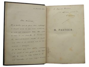 322. VALLÉRY-RADOT (René). Réunion de deux ouvrages avec envoi et une lettre autographe signée : • M. Pasteur. Histoire d’un savant par un ignorant. 11e édition revue et augmentée. Paris, Hetzel, s. d. (vers 1889). In-8, reliure à la Bradel (signée Pierson) percaline vert marbré, fleuron doré au dos, pièce de titre maroquin brun. Couvertures conservées. xiv-(2)-446 pp. Portrait par Champollion en frontispice. Rousseurs. Exemplaire comportant un envoi signé sur le faux-titre : A Auguste Dorchain, Très affectueux souvenir de L’Ignorant et accompagné d’une lettre (3 pp. in-12) au même, datée du 4 janvier 1890 : … M. Pasteur a été particulièrement touché de ce que vous dîtes de ses travaux avec des sentiments si français. Je ne veux pas vous répéter comment j’ai parlé à mon grand et cher beau-père de vous, de votre talent et de votre caractère… Valléry-Radot épousa la fille de Louis Pasteur le 4 nov. 1879. L’édition originale de cette première biographie consacrée au savant parut en 1884. • Mme de Sévigné. Paris, Lecène, 1888. In-8, reliure (signée V. Champs) maroquin bleu nuit, dos à 5 nerfs orné, tête dorée. Couvertures conservées. 310-(1) pp. Rousseurs. Édition originale. Envoi signé sur le faux-titre : A Monsieur Ernest Thorin Hommage de respectueuse sympathie.