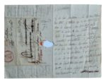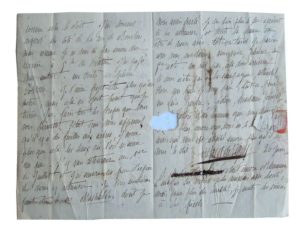 329. VIGNY (Alfred de, 1797-1863). Lettre Autographe signée. Adresse à Paris biffée et remplacée (d’une autre écriture) par : Gallardon Chateau d’Auneau dept d’Eure-et-Loir. Bellefontaine 28 juin 1822. Billet 3 pp. in-12, replié. Déchirure et annotations au crayon. Je ne sais, Madame, où va vous trouver ma lettre, je tremble que ce ne soit déjà dans les champs. Me voici déjà aussi tout au milieu de leur silence à entendre voles les mouches, après la sixième sommation infructueuse, le maître de céans est venu me chercher lui-même à Paris et me faire partir sans me laisser le tems de crier ni de dire Adieu à qui que ce fût. Je me suis en allé avec cette docilité d’enfant qui me prend avec mes amis quand j’ai tort … Je vous conduirai peut-être à ces Macchabées dont je vous avais parlé, je ne suis plus le seul à présent à les admirer, et toute la France va être de mon avis… La pièce citée par Vigny dans sa lettre, Les Machabées ou Le Martyre, tragédie en 5 actes par Alexandre Guiraud, fut representée pour la première fois le 14 Juin 1822 au théâtre de l’Odéon.