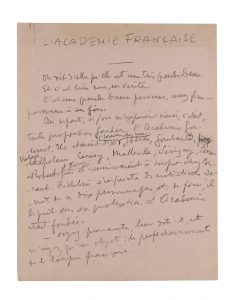 suivie de bons mots qu'elleapuinspirer(ff.5-6):«Pironpassantdevantl'Académie: - Ils sont là quarante qui ont de l'esprit comme quatre ! » « ... or, eLLe a maintenant trois siècLes D'existence - et maLgré ses erreurs , en Dépit De ses fautes et nonobstant son âge, eLLe continue D 'avoir Le saLon De beaucoup Le mieux hanté Du monDe . Depuis trois siècles, elle a reçu dans son giron 581 personnes du sexe masculin, choisies parmi les plus illustres et, plus souvent encore, parmi les moins connues. Chaque fois qu'elle accueille un homme très illustre, elle accueille quatre inconnus. j'entends par inconnus, connus pour leurs vertus, leurs grades dans l'armée, leurs titres de noblesse, leurs dignités ecclésiastiques, ou leur notoriété politique - enfin, communs pour cent raisons valables et pour leurs talents. C'est qu'elle a conservé, voyez-vous, ses manières - et même, ses manies. Elle fait bon visage à des évêques superflus et refuse sa porte aux hommes de génie - mais à tous, c'est là sa force. Elle ignore Molière - mais reçoit Racine. Elle oubliera Jean-Jacques - mais elle prend Voltaire. Elle ne connaítra pas le nom de Lavoisier - mais, devant Louis Pasteur, elle s'inclinera. Elle laissera passer Balzac - mais il est juste d'ajouter qu'elle ne retiendra pas non plus Flaubert - ni Michelet, d'ailleurs - et c'est là sa faiblesse. Il est vrai qu'au "départ" elle avait négligé Corneille - et c'est tout dire !... » avec une Première esquisse du texte, très corrigée, sur 2 autres feuillets.