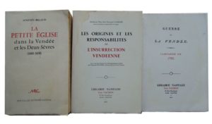 352. [VENDÉE, Histoire]. Réunion d’ouvrages : • Anonyme. Guerre de la Vendée. Campagne de 1793. Nantes, Lib. Nantaise, Yves Vachon, 1977. In-8, broché. Pliure en couverture. (6)-xvii-168-(1) pp. Réimpression tirée à 350 ex. de l’édition de Londres, Spilsbury, 1805. • BILLAUD (Auguste). La Petite Église dans la Vendée et les Deux-Sèvres (1800-1830). Avec une carte. Paris, N.E.L.,1962. In-8, broché. (6)-xvii-654-(1) pp. • CHAMARD (R. P. Dom François). Les Origines et les Responsabilités de l’Insurrection Vendéenne. Nantes, Lib. Nantaise, Yves Vachon, 1977. In-8, broché. Trace de mouillures en couverture. (4)-452 pp. Réimpression de l’édition de Paris, Savaete, 1899.