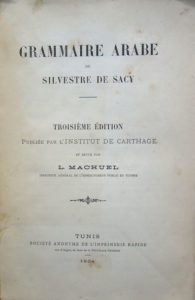 399. SACY (Silvestre de). Grammaire Arabe. Troisième édition publiée par l’Institut de Carthage et revue par L. Machuel. Tunis, Société Anonyme de l’Imprimerie Rapide, 1904-1905. 2 volumes in-8, brochés. Dos cassés, qq. déchirures au dos et en marge des couvertures. T. 1 : (8)-xviii-597 pp et 11 tableaux dépliants. T. 2 : xiv-(2)-695-84 pp et 3 tableaux dépliants. Bon état intérieur. La première édition de cette Grammaire fut publiée en 1810, la seconde en 1831. Dans l’avant-propos de cette 3e édition, V. Serres, Président de l’Institut de Carthage, annonce : Dans cette réimpression on a suivi page par page, et autant que possible, ligne par ligne, la 2e édition faite du vivant de l’auteur et qui est la plus complète… Il est inutile de dire que le texte de l’auteur est respecté scrupuleusement ; les seules corrections portent sur les erreurs matérielles … le tirage de cette réimpression est limitée. Silvestre de Sacy fut le premier titulaire de la chaire d’arabe de l’École des Langues orientales, créée en 1795 par la Convention.