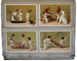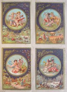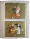 405. CHROMOS. Album d’environ 285 chromos. Fin XIXe s. In-4, reliure chagrin à décor or et noir. État d’usage. Album de chromos collées, la plupart au format 7 x 10,5 cm env. Qq. ff. illustrés de dessins au crayon et qq. ff. manquants. Chromos généralement classées par thèmes ou par séries : A la Ville de Paris; A la Ville de Saint-Denis (pierrots); Chemiserie A. Pillet; Au Croissant d’argent; Alcool de menthe de Ricqlès; Chocolat de la Marine; Chaussures J. Barbotin (journaux); Chocolat Grondard; Chocolat Devinck; Liebig; Au bon marché (jeux d’enfant, boissons, danses, animaux) …