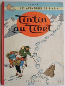 423. HERGÉ. Tintin au Tibet. Casterman, s. d. (1960). Dos toilé rouge B 29. Cartonnage en bon état, légers frottements sur les coupes, charnières internes fendillées, bel état intérieur. Édition originale belge (Imp. Casterman) avec le nom de la Compagnie Indian Airways (p. 2) qui fut ensuite modifié en Sari Airways à la demande de la Compagnie.