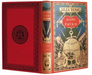 448. VERNE (Jules). Seconde Patrie. 68 illustrations par Georges Roux. Deux cartes. Douze grandes chromotypographies. Paris, Hetzel, s. d. (1900). Grand in-8, cartonnage éditeur percaline rouge « au globe doré » du 3e type, dos au phare, tranches dorées. Qq. légères décolorations sur les pourtours des plats et au dos, ors bien conservés. (4)-iv-471 pp. et 12 pl. hors texte en couleurs. Qq. rousseurs, un cahier un peu déboîté. In fine, catalogue BH (4 pp.), ultime catalogue de la maison Hetzel. Première édition grand in-8 illustrée. Jauzac p. 284.