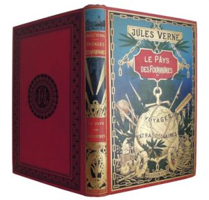 449. VERNE (Jules). Le Pays des Fourrures. Illustré par Férat & de Beaurepaire. Paris, Hetzel, s. d. (v. 1900). Grand in-8, cartonnage éditeur percaline rouge type « au globe doré »du 3e type, dos au phare. Ors bien conservés au dos et sur le plat, qq. petites taches de décoloration en bordure des plats. Qq. légers ressauts de ff., rousseurs parfois assez marquées. (4)-412 pp. et 6 planches en couleurs hors texte. Jauzac p. 196.