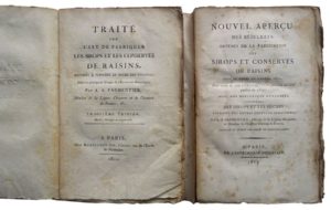 467. PARMENTIER (Antoine Augustin). Réunion de 2 volumes : • Traité sur l’Art de Fabriquer les Sirops et les Conserves de Raisins, destinés à suppléer le sucre des Colonies dans les principaux Usages de l’Économie domestique. 3e édition revue, corrigée et augmentée. Paris, Méquignon aîné, 1810. In-8, broché. Couverture d’attente papier bleu, étiquette imprimée au dos. Petites déchirures au dos. 388 pp. Traces de mouillure en tête sur la fin de l’ouvrage, rousseurs et qq. pages brunies. L’Empereur ayant fait appel aux chimistes pour rechercher des moyens de remplacer le sucre dont l’approvisionnement était interrompu par le blocus continental, Parmentier (1737-1813) travailla sur le sujet et fit paraître ses premiers travaux sous le titre Instruction sur les moyens de suppléer le sucre… dès 1808. Vicaire 658; Oberlé, Fastes 835, 836. • Nouvel Aperçu des Résultats obtenus de la Fabrication des Sirops et Conserves de Raisins dans le cours de l’année 1812, pour servir de suite à l’Instruction sur cette matière publiée en 1809 ; avec des réflexions générales concernant les sirops et les sucres extraits des autres végétaux indigènes. Paris, de l’Imprimerie Impériale, 1813. In-8, broché. Couverture d’attente papier bleu, étiquette imprimée au dos. Déchirures au dos, premier plat détaché. (4)-458 pp. et 4 planches dépliantes hors texte. Traces de mouillure et rousseurs sur tout le volume. En partie non coupé. Édition originale peu courante. Un Aperçu des résultats obtenus… dans le cours des années 1810 et 1811… publié en 1812 est également qualifié de « rare » par Oberlé, Fastes, 837. Celui-ci, consacré aux résultats obtenus en 1812, est le dernier ouvrage paru du vivant de l’auteur. Non cité par Vicaire, manquant à Oberlé.
