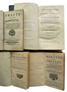 485. DESBOIS, DUBÉ et alii. Réunion d’ouvrages : • DESBOIS de ROCHEFORT (Louis). Cours Élémentaire de Matière Médicale, suivi d’un précis de l’Art de formuler. Ouvrage posthume. Paris, Méquignon, 1789. 2 volumes in-8, reliure de l’époque basane marbrée, dos lisse orné, pièce de tomaison basane verte. Coiffes usées, qq. frottements et épidermures. T. 1 : xlviii-488 pp. T. 2 : xii-438-(6) pp. Qq. rousseurs. Edition originale précédée d’un éloge de Desbois de Rochefort (1750-1786) par Jean-Nicolas Corvisart qui fut son élève puis son suppléant à l’hôpital de la Charité. • DUBÉ (Paul). Le Médecin des Pauvres… 7e édition reveuë, corrigée & augmentée de quelques traitez… Paris, Edme Couterot, 1699. Suivi de : DUBÉ (Paul). Le Chirurgien des Pauvres… 7e édition reveuë, corrigée & augmentée. Paris, Edme Couterot, 1693. 2 ouvrages en un volume in-12, reliure de l’époque veau brun, dos à 5 nerfs orné. Manque le caisson de tête, mors en partie fendus. (86)-444-(24)-102-(2) pp. Qq. rousseurs. • HELVETIUS. Traité des Maladies les plus Frequentes, et des Remedes propres à les guerir. Nouvelle Edition. Tome 1. Paris, Le Mercier, 1798. In-12, reliure de l’époque basane marbrée, dos à 5 nerfs orné. (12)-501-(23) pp. Qq. rousseurs. Table des Matières in fine. Tome premier seul. • QUESNAY (François). Traité de la Gangrène. Paris, Vve d’Houry, 1771. In-12, reliure de l’époque basane marbrée, dos à 5 nerfs orné. Qq. trous de vers sur le mors du premier plat fendillé sur qq. cm en pied, qq. frottements. (8)-507 pp. Qq. rousseurs.
