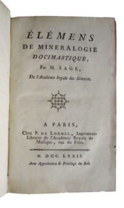 526. SAGE (Balthasar Georges). Élémens de Mineralogie Docimastique. Paris, P. de Lormel, 1772. In-8, reliure veau brun marbré, dos à 5 nerfs orné, pièce de titre maroquin bordeaux, tranches rouges. Qq. légers frottements sur les mors et coupes, un coin usé. xxiv-276 pp. et 1 tableau dépliant. Rares rousseurs. Table des Matières et errata en fin de volume. Édition originale de cet ouvrage sur l’examen et l’analyse des minerais par B. G. Sage (1740-1824), minéralogiste, fondateur et premier directeur de l’École des Mines, qui refusa de se rallier aux théories de Lavoisier et de Haüy.