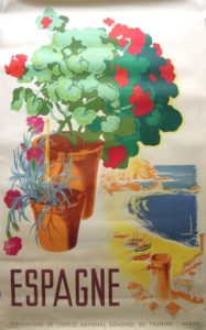 544. PUBLICITÉ. MORELL MACIAS (Josep, 1899-1949). Réunion de deux affiches pour l’Office National Espagnol du Tourisme, vers 1949. Deux affiches lithographiées, 100 x 62 cm, aux couleurs vives, l’une représentant une femme devant la mer (Madrid, Imp. Seix y Barral), l’autre représentant deux pots de fleurs (géraniums et œillets) en surplomb d’un port (Madrid, Graficas Laborde y Labayen). Petit accroc sans manque au centre d’une planche. Couleurs vives, bel état général.