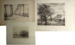548. ROCHE (Marcel, 1890-1959). Réunion de trois gravures : • La Prairie en Hiver. S. d. Eau-forte, 23,5 x 28,5 cm à la cuvette (dimension totale : 34,5 x 50 cm), signée au crayon en bas à droite, inscription en bas à gauche : 6/12 sur pur chiffon. Ex-dono de Claude Breton (peintre et graveur, neveu de Marcel Roche) en marge inférieure. • Le Croisement de Routes. S. d. Eau-forte, 17 x 26,8 cm à la cuvette (dimension totale : 28,2 x 38,2 cm), signée dans la planche et au crayon en bas à droite, inscription en bas à gauche : 1/20 sur Arches. Ex-dono de Claude Breton en marge inférieure. • Croquis Printanier. 1948. Eau-forte, 12,5 x 16,7 cm à la cuvette (dimension totale : 24,5 x 31 cm), monogrammée et datée 24/3/48 dans la planche, signée au crayon en bas à droite, inscription en bas à gauche : 1/10 s/ van Gelder. Ex-dono de Claude Breton en marge inférieure.
