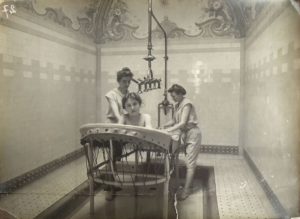 572. [Photographies]. LA BOURBOULE. Réunion de 12 photo-graphies et 3 plaquettes sur La Bourboule et ses cures thermales : • Thermes de La Bourboule : 2 tirages fin XIXe s. Réunion de 2 tirages montés sur carton : Vue extérieure animée des Thermes (12,4 x 17 cm) et une vue de l’intérieur (21,3 x 16,7 cm). • Thermes de La Bourboule : Réunion de 10 tirages albuminés. 10 photos (16,7 x 22,8 cm env.) dont 4 vues des Thermes, des environs et de la source Croizat et 6 scènes de soins avec curistes et soignants. Qq. pliures et petites déchirures. • BOUDRY (Dr). La Cure Bourboulienne dans les Malades de l’Enfance. Paris, Gazette maladies infantiles et obstétrique, 1907. In-8, broché. Déchirure de 3 cm en couverture. 24 pp. • CHRISTIN (Dr). Arsenical Cure to La Bourboule. Medical and touristic guide. Paris, Steinheil, 1906. In-8, broché. 20 pp. Vue de La Bourboule en frontispice. • SERSIRON (Dr). La Cure Arsénicale et les nouvelles salles d’inhalation de La Bourboule. Paris, Masson, 1905. In-8, broché. 20 pp. et 4 pl. dépliantes (5 annoncées). Photographie en frontispice et dans le texte.