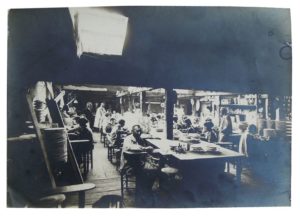 573. [Photographies]. [LONGCHAMP, Faïencerie de, Côte d’Or]. Réunion de 5 photographies. Vers 1930. Réunion de 5 photographies, en tirage d’époque : • 4 vues des ateliers prises dans les années 1930, dont 3 légendées et datées au verso : Coco et le père Brice ; Atelier d’emballage des commandes ; Atelier de peinture : Mr Jacquemin Chef de l’Atelier et M. Brice contremaître. Env. 12 x 16,8 cm. Petit manque en angle de 2 photographies. • Plats décoratifs et vases. 13 x 18 cm.