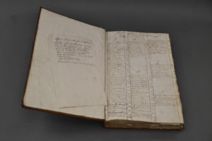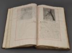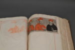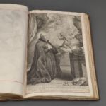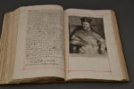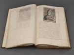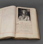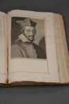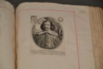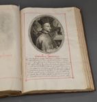 suivent les feuillets 12 à 368 (sans manques apparents, et erreurs de foliotation) débutant par le pape Urbain VI jusqu’à Urbain VIII, 38 portraits. (Importantes notices biographiques manuscrites pour les papes Urbain VI à Pie IV). Suivis des Cardinaux, dont une galerie de 67 portraits dont l’habit et la calotte ont été rehaussées à l’encre rouge, avec les dates de leurs nominations (1583 à 1608), et suivent 175 portraits de personnalités ecclésiastiques dont Richelieu, Mazarin, Ioannes Miraeus, Cornelius Janssen, Ignace de Loyola, Georges Froger, etc. Un cadre l’encre rouge délimite, recto/verso l’espace utilisé, ou prévu pour les gravures et leurs notices. Volume in-folio, relié veau brun de l’époque, dos à nerfs orné. (quelques défauts d’usage). Ex-libris Dubois de Foisseux.