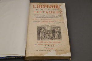 de Sacy, sous le nom du sieur de Royaumont, prieur de Sombreval. Paris, Michel Etienne David, 1723. In-folio demi-basane maroquinée noire du XIX° siècle, dos lisse orné. (feuillet de titre restauré, premiers et derniers feuillets remontés). Edition ornée d’une vignette de titre, d’en-têtes, de lettrines et de nombreuses gravures à mi-page qui retracent les principaux épisodes de l’histoire sainte.
