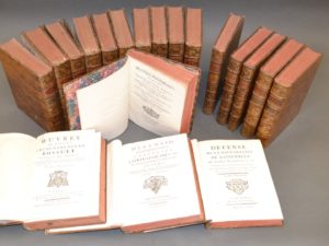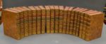 édition collective rare des oeuvres de Bossuet, après celle donnée entre 1743 et 1747. Selon Verlaque, «il y a quelques changements dans les préfaces, la plus notable est au tome XI, sur la lettre aux religieuses de Port-Royal». L'édition est illustrée d'un portrait de Bossuet gravé par Edelinck d'après Rigault et de 12 bandeaux, dont certains répétés, dessinés notamment par Cochin fils et gravés par lui-même, Tardieu fils et Haussard le jeune.]. Suivi de : BOSSUET. Defensio declarationis conventus Cleri Gallicani An. 1682. De ecclesiastica potestate. Amsterdam, sumptibus Societatis, 1745. 2 volumes in-4, reliés veau marbré, dos à nerfs orné, tranches rouges (reliure de l' époque). Suivi de : BOSSUET. Défense de la déclaration de l’Assemblée du Clergé de France de 1682. Touchant la puissance écclésiastique. Amsterdam, aux dépens de la Compagnie, 1745. 3 volumes in-4, reliés veau marbré, dos à nerfs orné, tranches rouges (reliure de l'époque). Suivi de : BOSSUET. Oeuvres posthumes de Messire Jacques-Benigne Bossuet. Pour servir de supplément aux dix-sept volumes de ses ouvrages, ci-devant publiés in-4°. Amsterdam, aux Dépens de la Compagnie, 1753. 3 volumes in-4, reliés veau marbré, dos à nerfs orné, tranches rouges (reliure de l'époque). Bel ensemble de 19 sur les 20 volumes des œuvres complètes de Bossuet. Manque le tome 8. Quelque coiffes et coins émoussés.