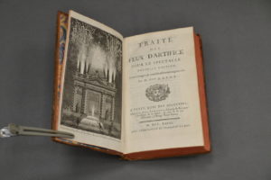 orné, tranches rouges. (petit accroc à une coiffe, 2 coins émoussés). Illustré d'1 titre-frontispice, 3 bandeaux historiés gravés et 13 planches dépliantes hors-texte. En 1705 parait l'édition originale. Une seconde édition est demandée à l'auteur en août 1739 à l'occasion du mariage d'Élisabeth de France. Sans matière nouvelle à proposer, Frézier laissa traîner l'offre mais, en 1741, le librairie hollandais Neaulme débitait une seconde édition non autorisée et, en 1745, Jean-Charles Perrinet d'Orval (à qui on attribue souvent cet ouvrage) publiait son Essai sur les feux d'artifice. Entre- temps, l'annonce de la nouvelle édition de son ouvrage avait été publiée en 1742 dans le Mercure de France et en 1745 dans les Mémoires d'artillerie de Saint-Rémy. Finalement, en 1747, paraît cette seconde édition qui corrige en partie l'ouvrage de Perrinet.
