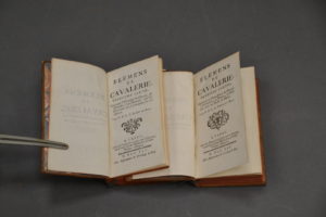 [LA GUERINIERE]. Elemens de cavalerie. Par M. D. L. G. Paris, Guérin, 1741. 2 volumes in-16 reliés basane fauve de l’époque, dos à nerfs ornés, tranches rouges. Ornés de 4 planches dépliantes.