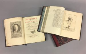 à lviii de l’intoduction). 24 planches (1 frontispice, 9 portraits, 8 planches métalliques, 2 tables généalogiques, 2 cartes, 1 planche et 1 planche dépliante), bandeaux, culs-de-lampe. La note contre Voltaire par le Président de Brosses se trouve pp 467 à 470. Cette note a été supprimée dans la plupart des exemplaires. Les fragments de Sallustre qui manquent souvent sont placés à la fin du tome 3. Cachet armorié à froid sur la première page de titre.
